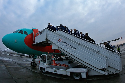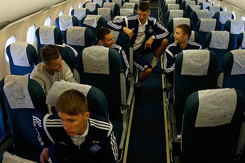 Некоторое время пришлось подождать вылета уже на борту, ведь ради безопасности полета в холодное время года поверхность самолета обрабатывается специальной жидкостью. В это время некоторые футболисты воспользовались возможностью позвонить родным перед почти 5-часовым перелетом, кое-кто уже наслаждался любимой музыкой в наушниках, а Олег Гусев на планшете знакомился с последними футбольными новостями и живо обсуждал их с клубными журналистами.В 9:20 самолет Airbus 320 компании Windrose поднял динамовцев в небо..jpg)