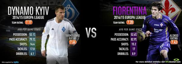 Opta сравнила статистические показатели будущих соперников в 1/4 финала Лиги Европы - «Динамо» и «Фиорентины» - на более ранних стадиях турнира. Как видим, они похожи - обе команды демонстрирует примерно одинаковый процент контроля мяча (52,1% и 52,6 соответственно) и количество отборов (17,8 и 17), однако «Фиорентина» точнее пасует (82,9% против 79,1%) и чаще бьет по воротам (15,2 против 14,4 в среднем), а также ее игроки чаще применяют дриблинг (8,9 против 6,1). В целом, Opta котирует «фиалок» несколько выше, чем «Динамо» (оценка 7,28 против 7,17), но разница настолько незначительна, что можно с уверенностью сказать, что жребий свел в четвертьфинале равных соперников. м